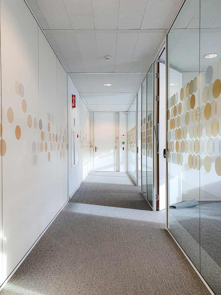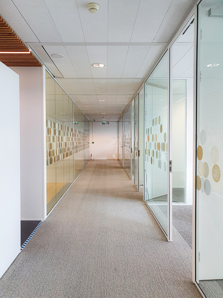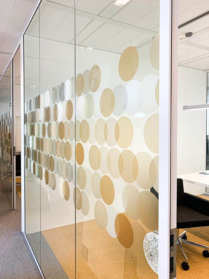 Voor een opdrachtgever in Utrecht ontwierp Studio JAN unieke glas visuals waarin de kernactiviteiten van de organisatie, namelijk data en omgeving, een centrale rol spelen. Door het concept van beide elementen te combineren, ontstond als het ware een basispatroon van ‘natuurlijke’ data.