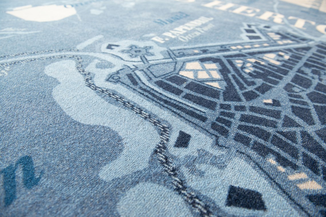 Op advies van interieurarchitect De Twee Snoeken gaf de gemeente ’s-Hertogenbosch Studio JAN de opdracht om een bijpassend bijzonder kleed op basis van een oude landkaart uit 1841 uit te werken.
